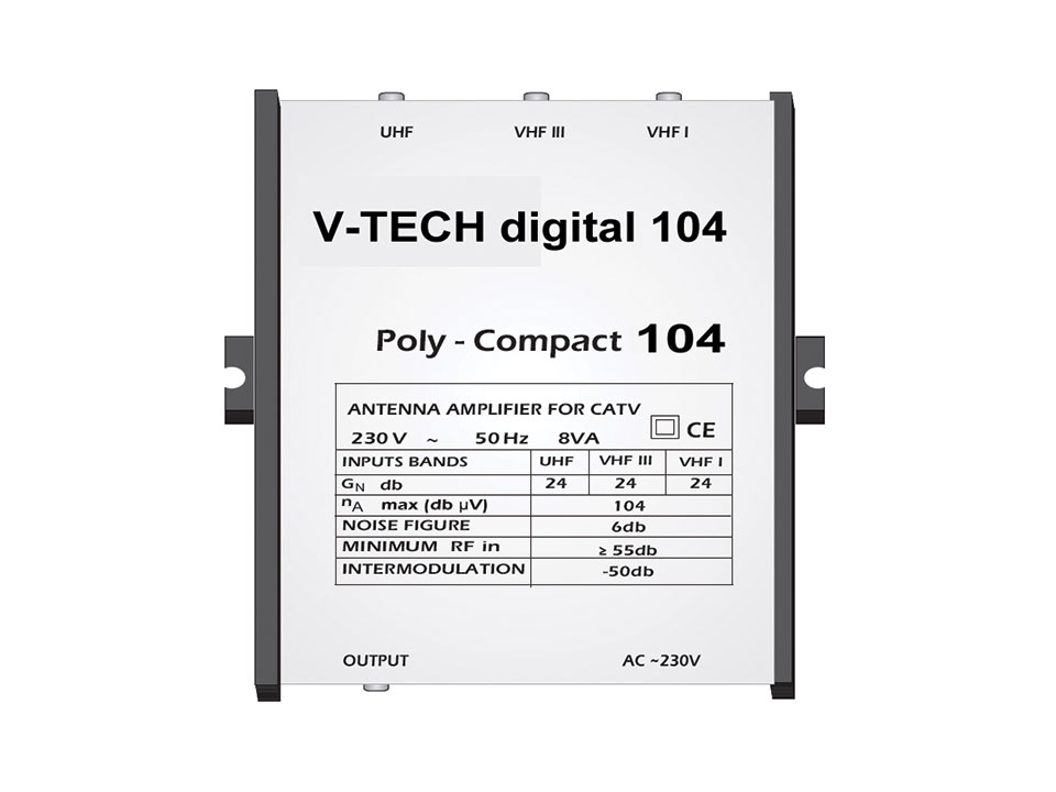 V–TECH DIGITAL 104: Καλύπτει από 10 έως 20 πρίζες ανάλογα με το μοντέλο. Σε μεταλλικό σασί με ξεχωριστές εισόδους, ειδικές θωρακίσεις για εξάλειψη τυχόν ενδοδιαμορφώσεων, ξεχωριστές βαθμίδες τελικής ενίσχυσης για κάθε είσοδο που προσφέρουν πλήρη διαχωρισμό σημάτων και αύξηση της ισχύος με χαμηλό συντελεστή θορύβου. Σε κάθε είσοδο διαθέτει εξασθενητές 0 έως 20 dB.