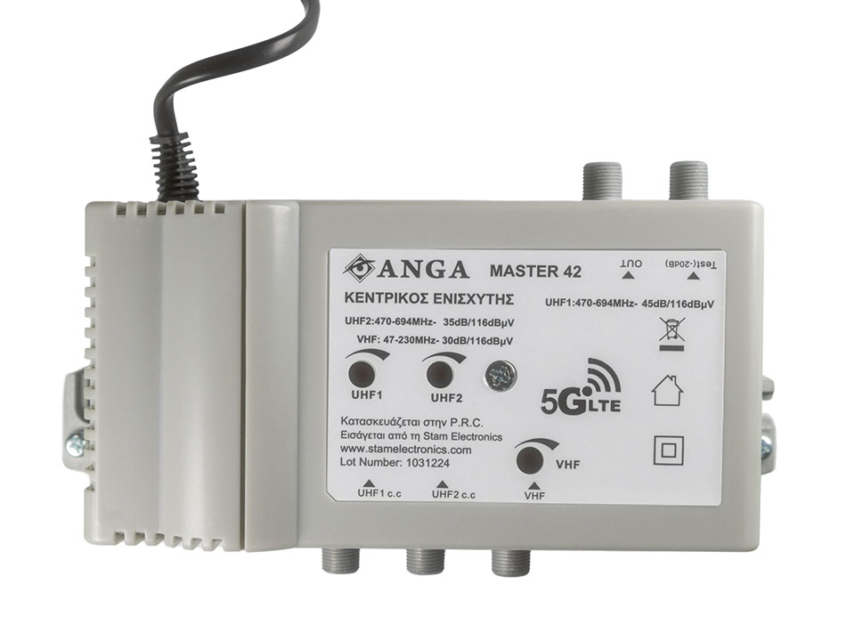 ANGA MASTER 27: Διαθέτει 1 είσοδο και 2 εξόδους, ενώ έχει ενσωματωμένο φίλτρο 5G LTE και λειτουργεί στα κανάλια 21-48 των UHF. Παρέχει ρυθμιζόμενη ενίσχυση έως 27dB, με μέγιστη στάθμη σήματος εξόδου 102dBμV.