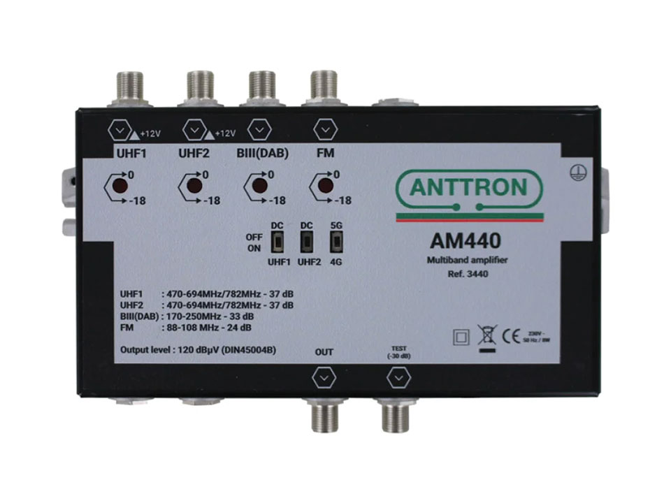 ANTTRON AM340: Multiband ενισχυτής με 3 εισόδους, αναμιγνύει τα σήματα που μπορεί να λαμβάνει από διαφορετικές κεραίες, αποδίδοντας σε μία έξοδο ένα σήμα για κεντρική διανομή. Συγκεκριμένα, έχει 1 είσοδο UHF που λειτουργεί στο εύρος συχνοτήτων 470-694 MHz / 782MHz (κανάλια 21-48 / 59 των UHF), 1 είσοδο BIII (DAB) που λαμβάνει σήματα 170-250 MHz και μία είσοδο FM για λήψη σημάτων 88-108 MHz. Η UHF είσοδός του μπορεί να τροφοδοτήσει προενισχυτή με τάση 12V, δυνατότητα που ενεργοποιείται μέσω διακόπτη. Έχει ενσωματωμένα φίλτρα LTE 5G/4G, παρέχοντας δυνατότητα επιλογής τους επίσης μέσω διακόπτη. Παρέχει ενίσχυση έως 40dB στα UHF, έως 33dB στα DAB και έως 24dB στα FM, με δυνατότητα ξεχωριστής ρύθμισης κάθε εισόδου για εξασθένιση της απολαβής κατά 0 έως -18 dB. Διαθέτει χαμηλό επίπεδο θορύβου <7dB και παρέχει στην έξοδο σήμα με μέγιστη στάθμη 120dBμV (DIN 45004B). Η ξεχωριστή ενίσχυση κάθε εισόδου σε συνδυασμό με το χαμηλό επίπεδο παραμόρφωσης, καθιστούν τον AM340 ιδανικό για εγκαταστάσεις μεσαίου μεγέθους.