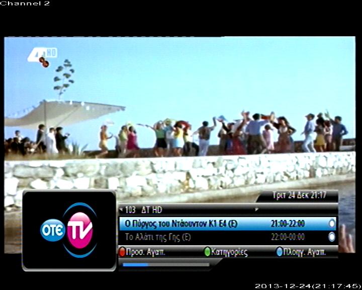Ανέβηκε σήμερα, παραμονή χριστουγέννων και στην δορυφορική πλατφόρμα του OTE TV, η υψηλής ευκρίνειας έκδοση της Δημόσιας Τηλεόρασης (ΔΤ HD). Το νέο κανάλι πήρε τη θέση 103 στη λίστα καναλιών του OTE TV και αυτή τη στιγμή μεταδίδει το ίδιο πρόγραμμα με αυτό του SD καναλιού. Πιθανότατα θα δείξει τον πύργο του Ντάουντον απόψε σε υψηλή ευκρίνεια.Ανέβηκε σήμερα, παραμονή χριστουγέννων και στην δορυφορική πλατφόρμα του OTE TV, η υψηλής ευκρίνειας έκδοση της Δημόσιας Τηλεόρασης (ΔΤ HD). Το νέο κανάλι πήρε τη θέση 103 στη λίστα καναλιών του OTE TV και αυτή τη στιγμή μεταδίδει το ίδιο πρόγραμμα με αυτό του SD καναλιού. Πιθανότατα θα δείξει τον πύργο του Ντάουντον απόψε σε υψηλή ευκρίνεια.