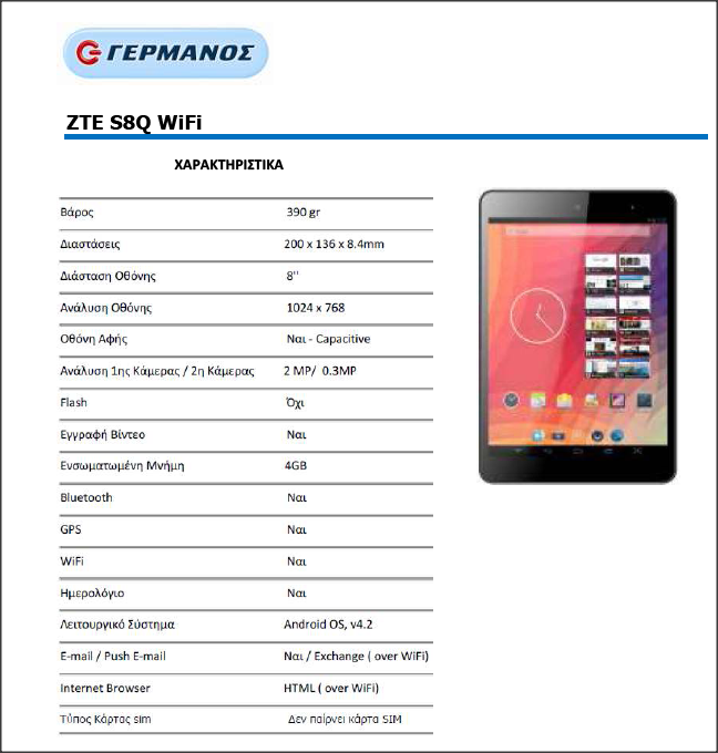 Το νέο tablet ZTE S8Q WiFi, το φθηνότερο tablet της αγοράς στην κατηγορία του, με οθόνη 8’’ HD IPS και πανίσχυρο τετραπύρηνο επεξεργαστή Cortex A7 @1.2GHz, έρχεται αποκλειστικά στο Δίκτυο Καταστημάτων ΓΕΡΜΑΝΟΣ, μόνο με 129,90€.