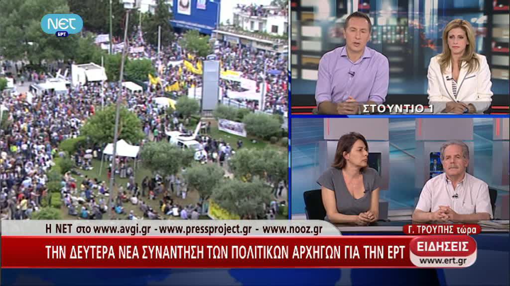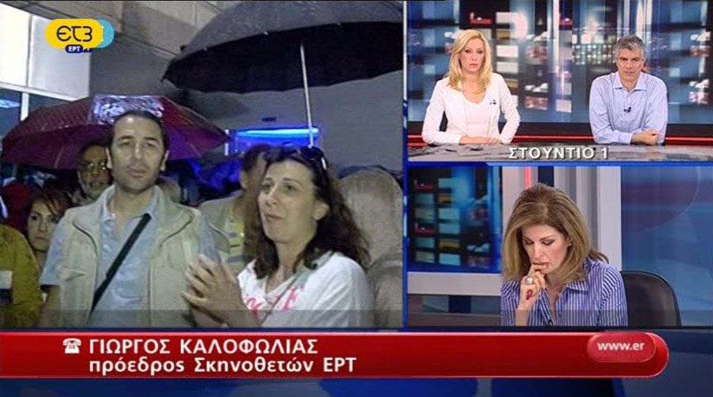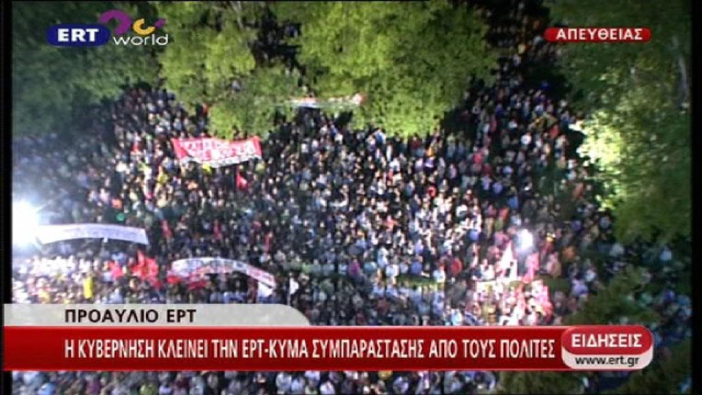 Έπειτα από γενική συνέλευση και μετά τις έντονες φήμες για συρρίκνωση της ΕΡΤ (1 κανάλι – 3 ραδιοσταθμοί) και απόλυση εκατοντάδων εργαζομένων, οι εργαζόμενοι αποφάσισαν να πάρουν στα χέρια τους την κατάσταση. Έτσι, αποφασίστηκε να περάσει το κτίριο στα χέρια τους, να συστήσουν ομάδες περιφρούρησης εσωτερικά και εξωτερικά του κτιρίου, το πρόγραμμα να παίζει κανονικά, αλλά με συχνές παρεμβάσεις των εργαζομένων ώστε να συζητιούνται τα δίκαια αιτήματά τους. Αυτή τη στιγμή οι εργαζόμενοι είναι σε διαρκή συνέλευση και καλούν κόσμο για αλληλεγγύη στο κτίριο της Αγίας Παρασκευής. Σε λίγο θα αποφασιστεί το πρόγραμμα των δράσεων οι οποίες θα είναι διαρκείς και ανοιχτές στον καθένα και την καθεμία. Η στήριξη των αγωνιζόμενων εργαζομένων της ΕΡΤ είναι υποχρέωση όλων μας.