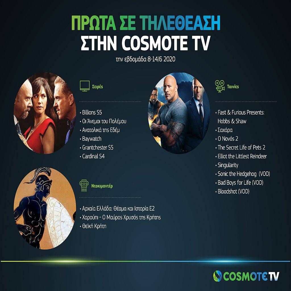 Μεγάλη επισκεψιμότητα υπήρξε και στον δωρεάν on demand κατάλογο της COSMOTE TV, στον οποίο συμπεριλαμβάνονται πάνω από 800 ταινίες και 130 σειρές.Την εβδομάδα που πέρασε, οι τηλεθεατές προτίμησαν για ακόμα μία φορά το Fast & Furious Presents: Hobbs & Shaw, τις ταινίες «The Predator»(Ο Κυνηγός) του 2019 και «The Snitch Cartel» και τις σειρές «Cobra» και «Billions».