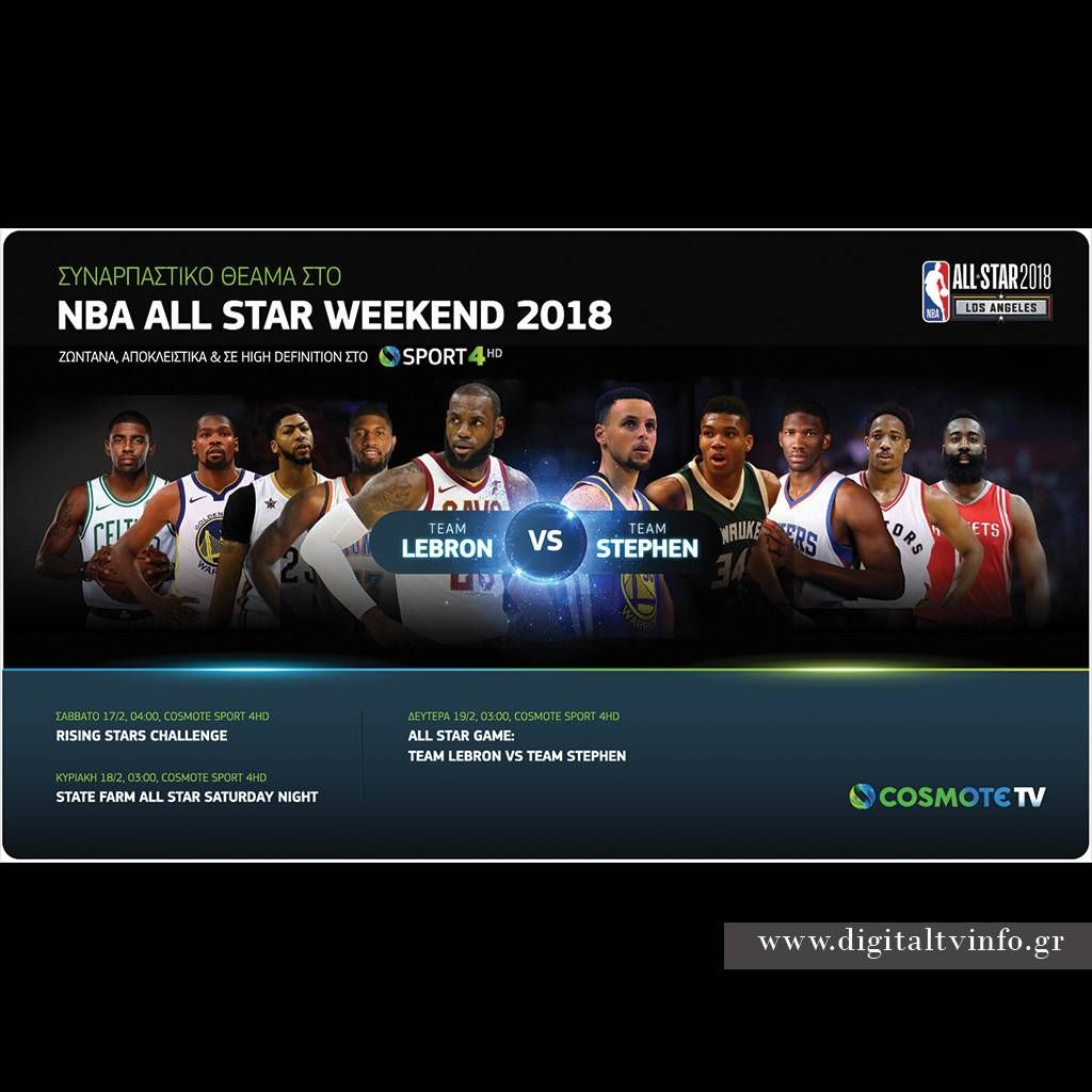 Στο μπάσκετ, ξεχωρίζει το τριήμερο δράσης από το NBA All Star Weekend (Σάββατο 17/2, 04.00 έως Δευτέρα 19/2, 03.00, COSMOTE SPORT 4HD) στο οποίο θα παρακολουθήσουμε και τον Γιάννη Αντετοκούνμπο, για δεύτερη συνεχή χρονιά. Ο «Greek Freak» επελέγη από τον Στέφεν Κάρι για να είναι στην ομάδα που θα αντιμετωπίσει τους εκλεκτούς του ΛεΜπρον Τζέιμς, τα ξημερώματα της Δευτέρας.