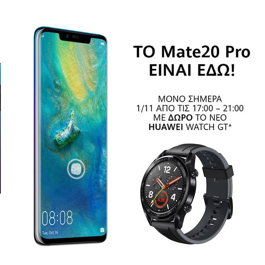 - Ύστερα από την εξαιρετική ανταπόκριση των καταναλωτών στις προπαραγγελίες του νέου Mate20 Pro, η Huawei επιβραβεύει και εκείνους που θα το αποκτήσουν πρώτοι την Πέμπτη 1 Νοεμβρίου, δίνοντάς τους δώρο το Huawei Watch GT!