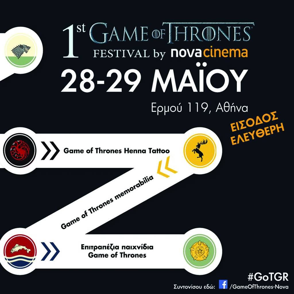 Τα κανάλια Novacinema αξιοποιώντας την πολυετή συνεργασία με την ΗΒΟ και την αποκλειστικότητα της πιο δημοφιλούς τηλεοπτικής σειράς, εγκαινιάζουν για πρώτη χρονιά το «1st Game of Thrones Festival by Novacinema» με πολλές και ενδιαφέρουσες δράσεις που απευθύνονται τόσο στους fun της σειράς, όσο και στο ευρύτερο κοινό. Το «1st Game of Thrones Festival by Novacinema» θα πραγματοποιηθεί το Σαββατοκύριακο 28 – 29 Μαΐου στον Πολυχώρο Κ8 Point, Ερμού 119 στην καρδιά της Αθήνας .