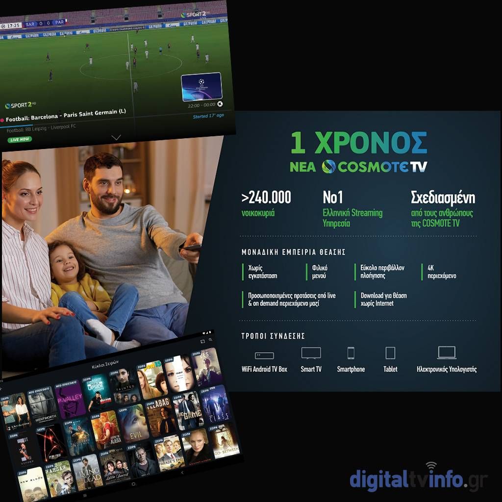 · Της εφαρμογής COSMOTE TV που διατίθεται για χρήση σε Smart τηλεοράσεις SAMSUNG (μοντέλα 2017 και μετά), SONY (μοντέλα 2016 και μετά), LG (αυτή τη στιγμή από μοντέλα του 2018 και μεταγενέστερα) και σε όσες Smart TVs φέρουν Android TV 8.0 και μεταγενέστερο.